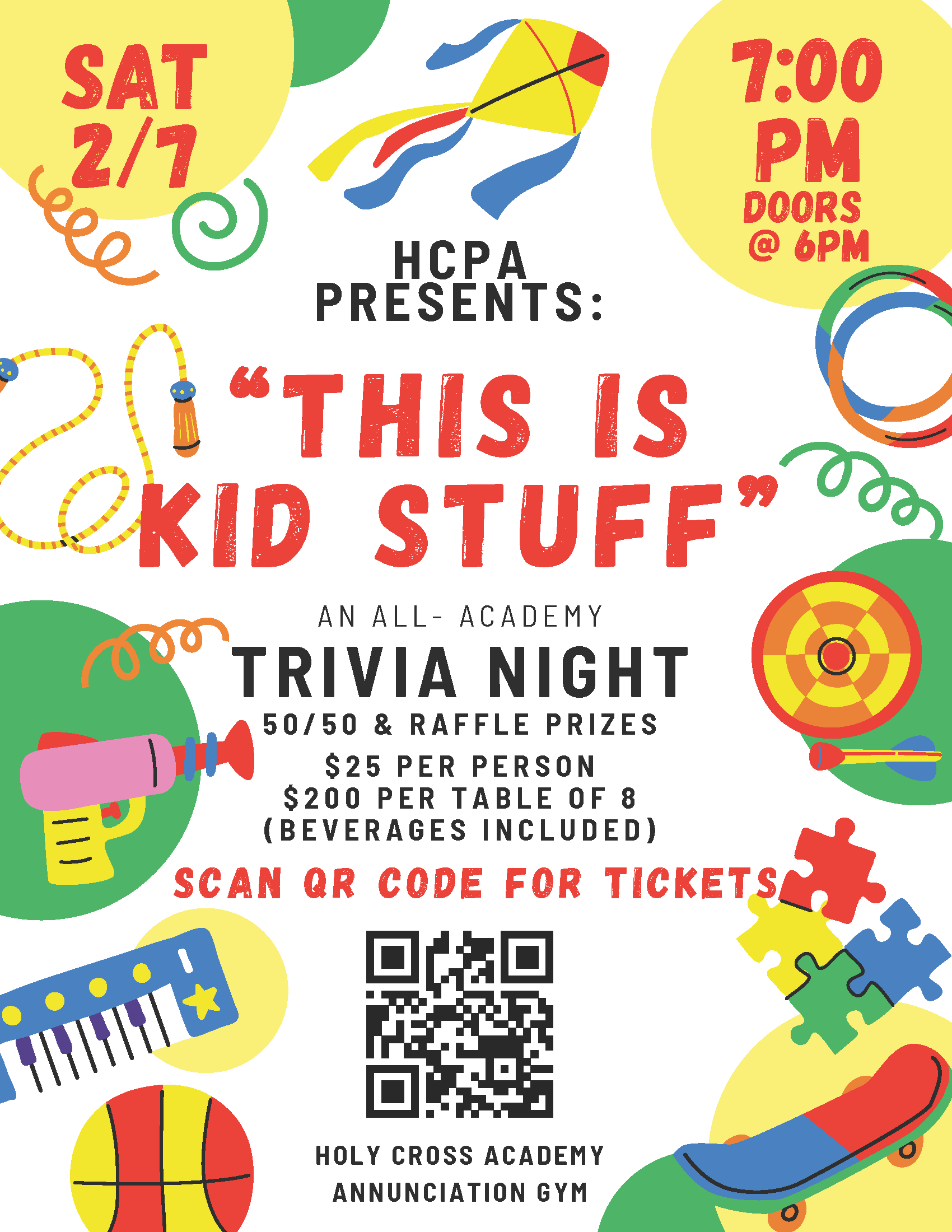 Jan 7, 2026 This Is Kid Stuff Trivia Night 2026Enjoy a night of fun and laughter at our HCPA Trivia Night at Annunciation in the gym! All proceeds benefit our students!